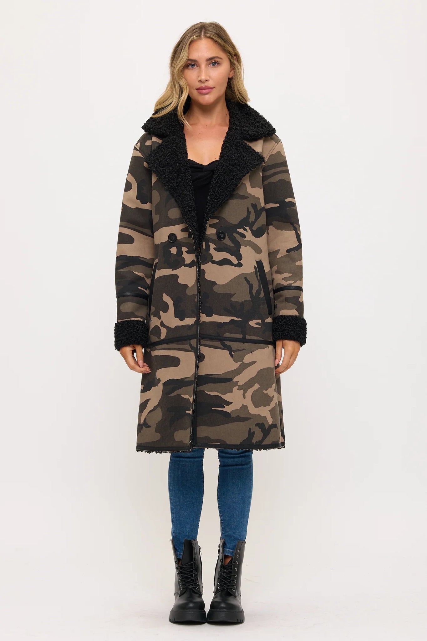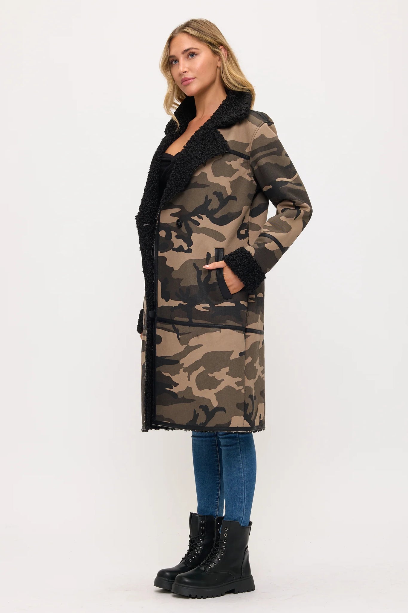 The relaxed silhouette offers comfortable wear while maintaining structured appeal through tailored lapels and open-front design. Premium synthetic fur provides exceptional softness against the dramatic camo print, creating striking textural contrast.