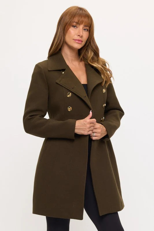 This sophisticated longline coat features classic double-breasted military styling with gold-tone button detailing for timeless elegance. The structured silhouette creates commanding presence while the fitted cut enhances feminine curves through strategic tailoring and refined proportions.