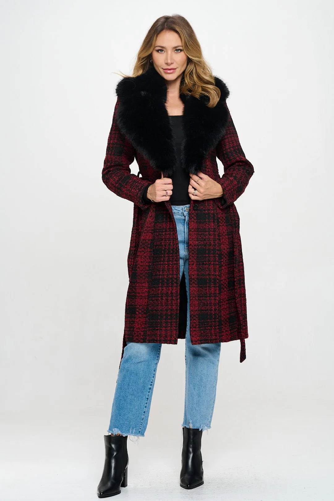 Command attention in our "Cosmopolitan Charisma" coat, a perfect marriage of classic pattern and luxurious texture. This sophisticated wrap-style coat features a striking black and cream plaid pattern and is dramatically accented with a sumptuous faux fur collar that frames the face beautifully. The self-tie belt creates a flattering silhouette while allowing for adjustable comfort. Crafted from premium vegan textiles, this coat offers the classic look of wool and genuine fur without any animal products. Available in classic black multi (as pictured) and bold red multi for those who prefer a more vibrant statement.