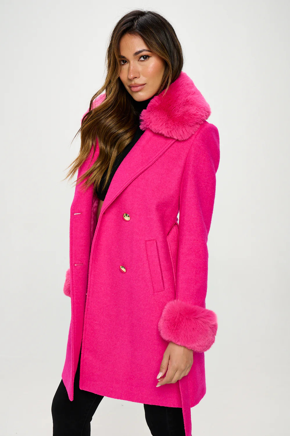 The flattering double-breasted silhouette is enhanced with gleaming gold buttons and a coordinating self-tie belt that defines the waist beautifully. Crafted from premium vegan wool-alternative fabric with plush, detachable faux fur trim, this coat delivers the opulent look and feel of luxury materials without any animal products. Fully lined for added warmth and comfort, it offers a perfect mid-weight construction for winter elegance.