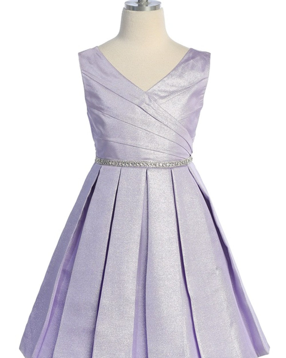 V-neck, metallic knee-length dress.Fully lined. Center back zipper. Knee length.