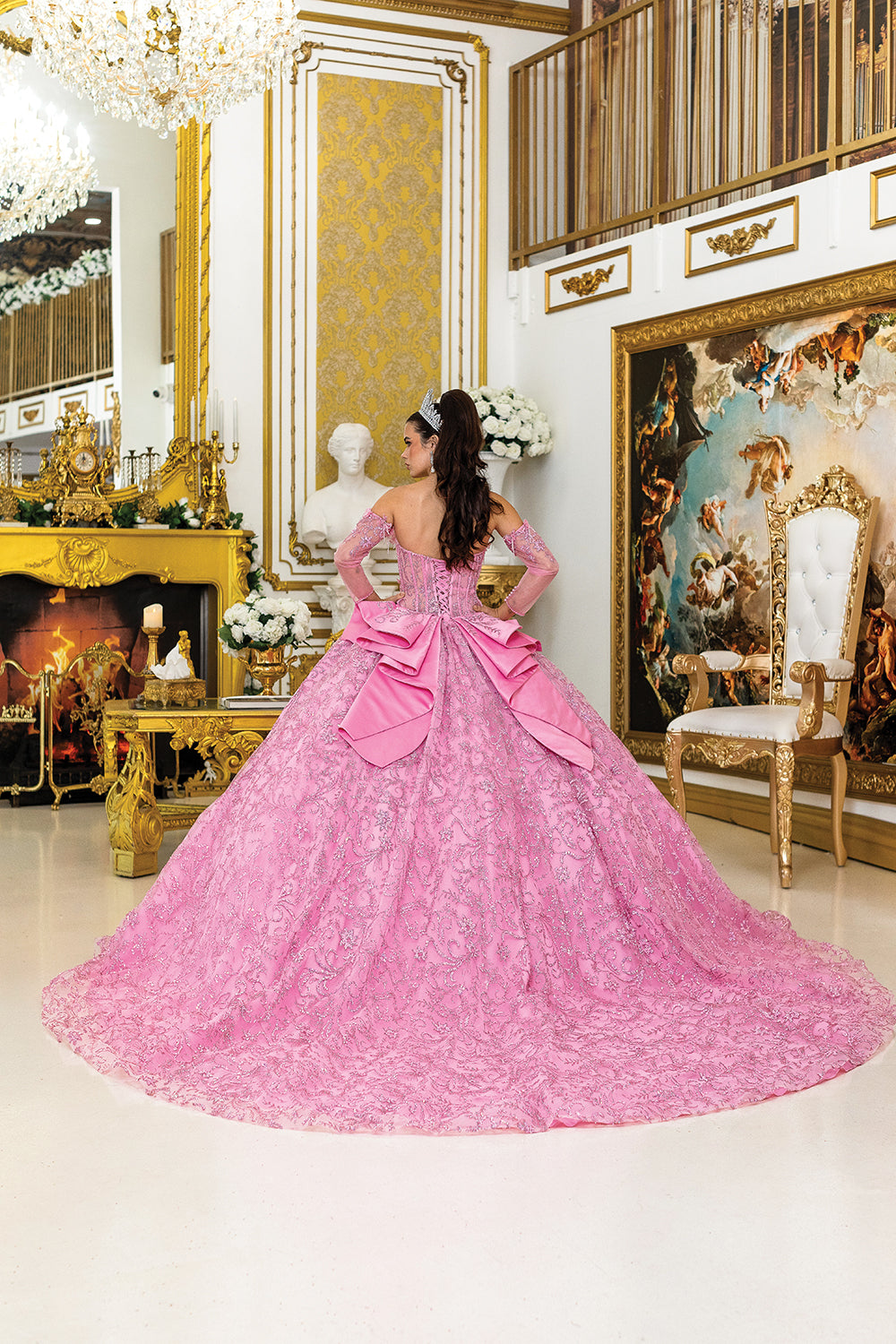 Quinceanera Dress with Sweetheart Neckline, Embroidered Lace Overlay, Sheer Long Sleeves, Glitter Tulle Skirt, and Dramatic Ball Gown Silhouette