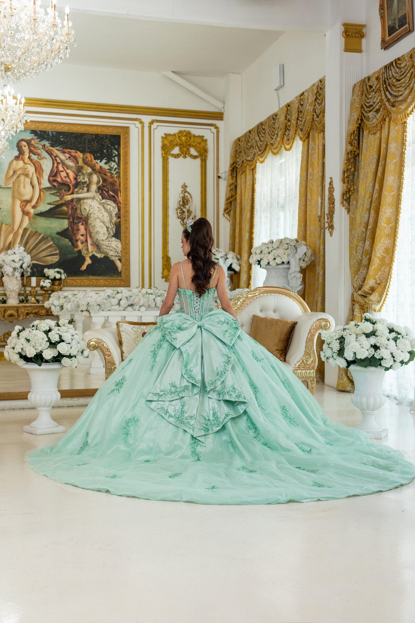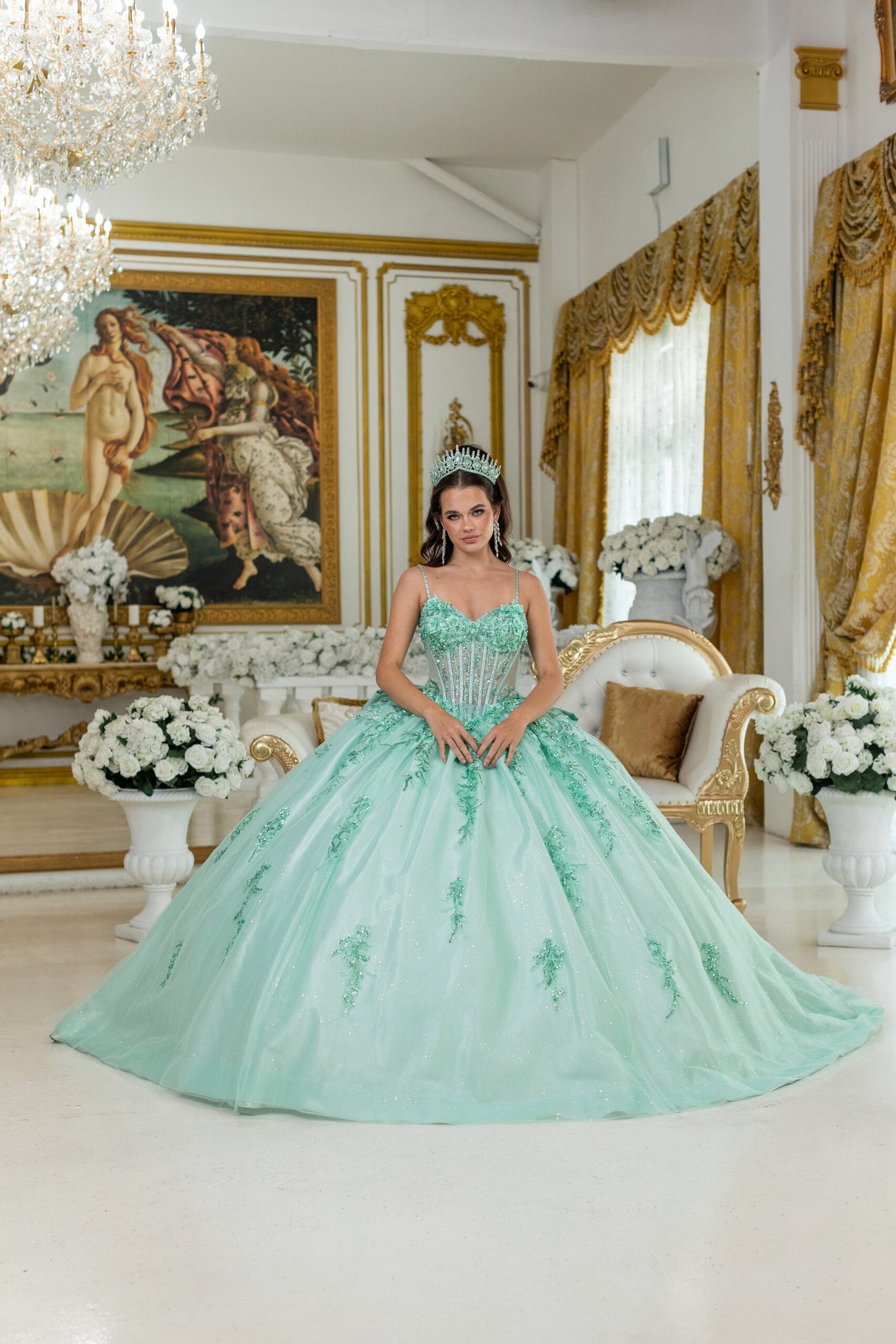 Strapless Ball Gown Quinceanera Dress with Beaded Corset Bodice and Floral Embroidered Tulle Skirt