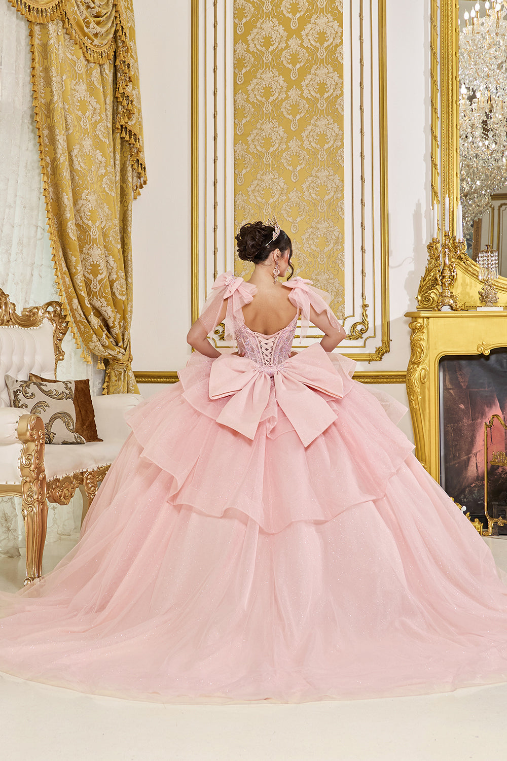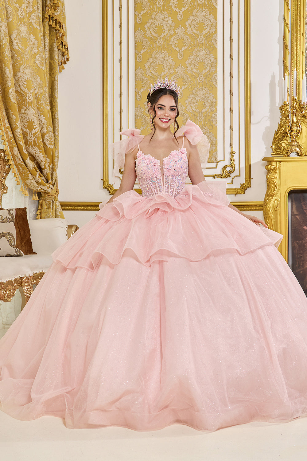 Layered Tulle Ball Gown Quinceañera Dress with Beaded Corset Bodice, Ruffled Skirt, and Detachable Puff Sleeves
