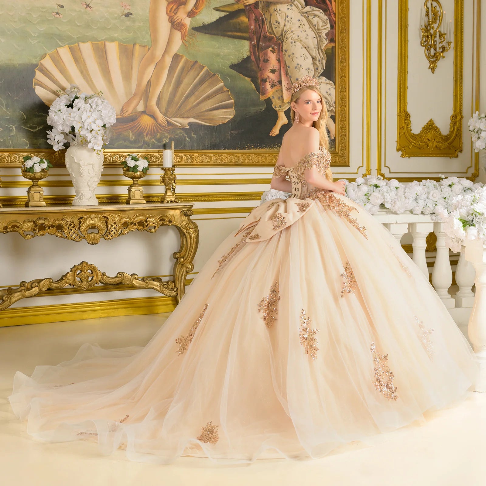 Make a dazzling entrance in this enchanting quinceañera ball gown, featuring embellished off-the-shoulder straps that frame a flattering V-neckline corset bodice. Unique bejeweled grommets add a touch of sparkle and edge to the design. Crafted from a layer of tulle over a shimmering glitter mesh underlayer, the gown is richly adorned with intricate embroidery, beads, sequins, and jewels for a show-stopping finish. The voluminous skirt flows into a train, complete with a detachable back bow for an added touch of charm and versatility.