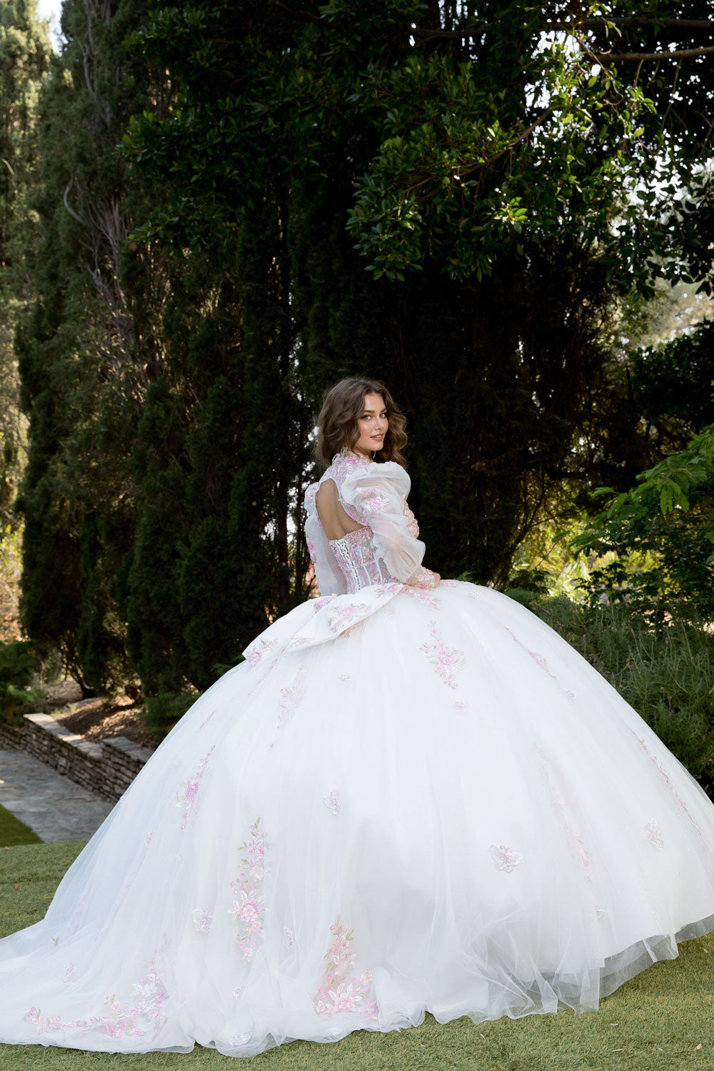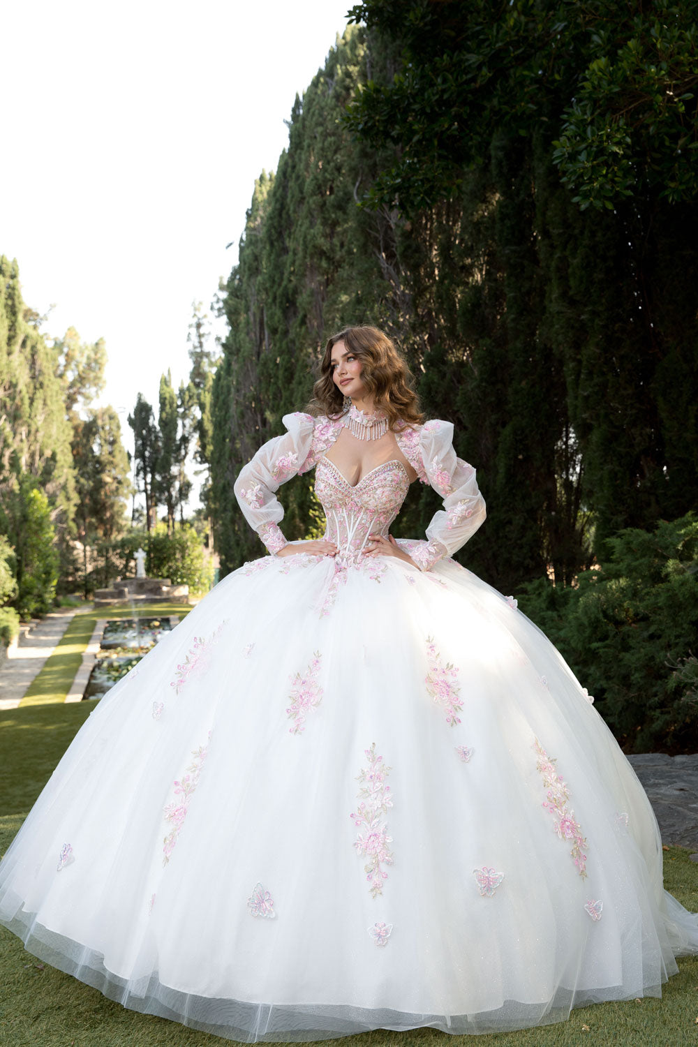 The strapless design keeps it sleek and modern, while the matching puff long-sleeve bolero adds a touch of drama with its elegant string beading at the center. Every inch of this gown is a masterpiece, with sparkling sequins, gems, and intricate beading adorning the bodice, and pink embroidery weaving a story of flowers and butterflies throughout the![]() ![]() ![]() ![]() ![]() ![]() ![]() ![]() skirt. |