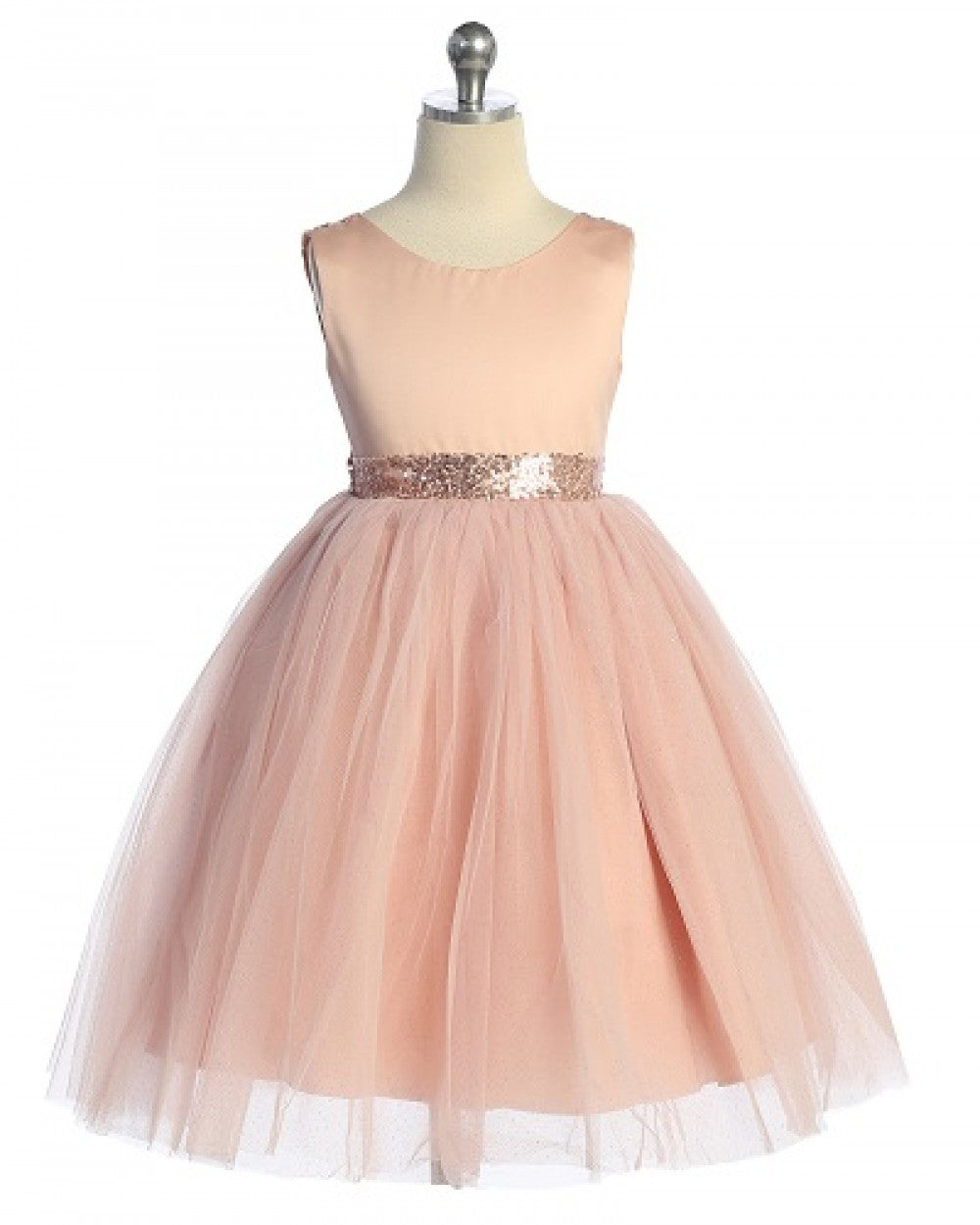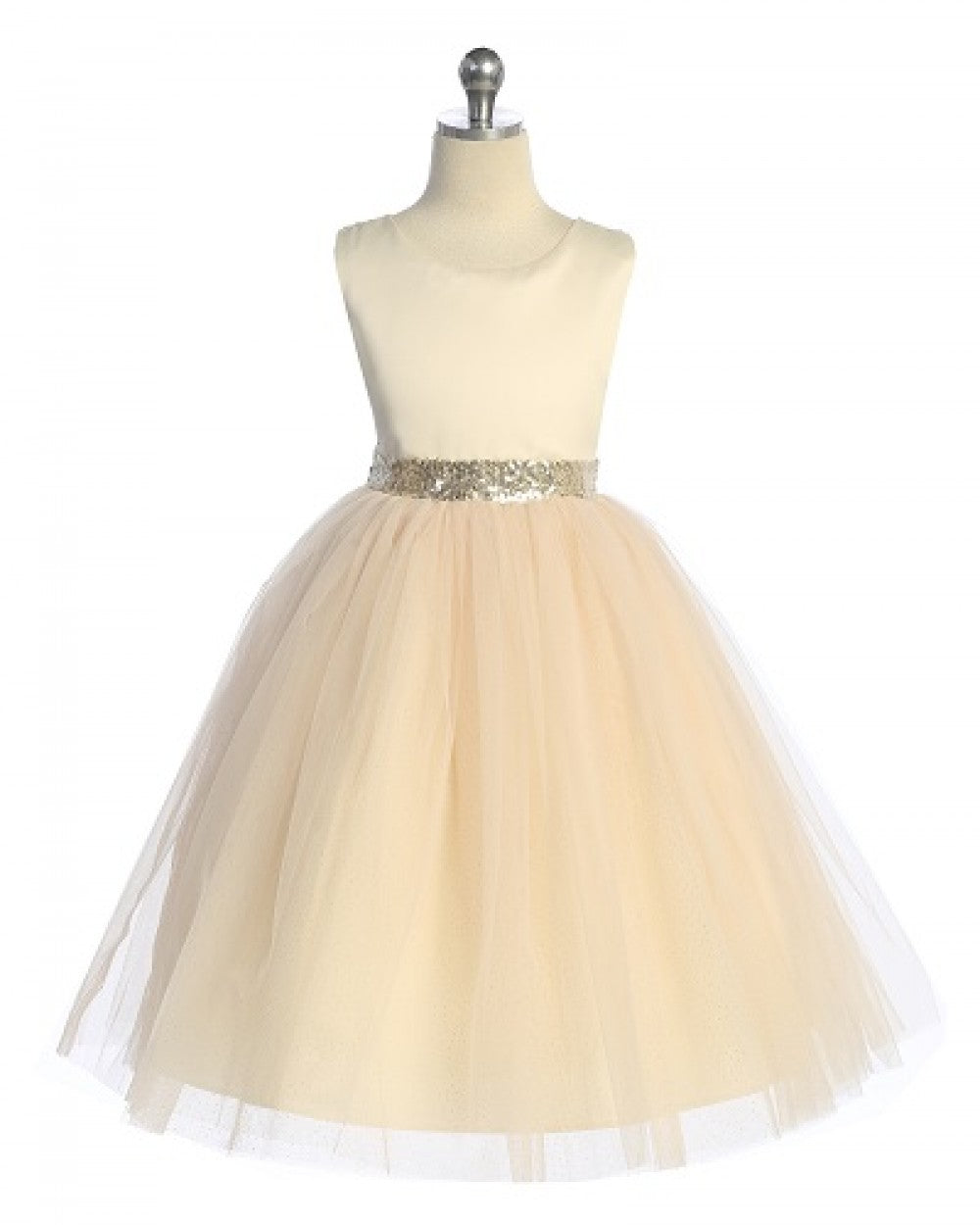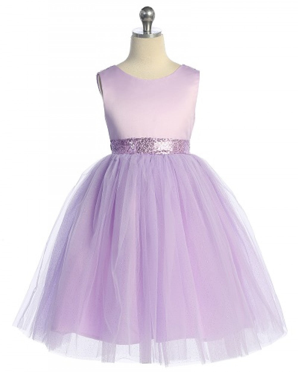 Satin and tulle dress with glitter sequin belt and v back. Detachable bow.